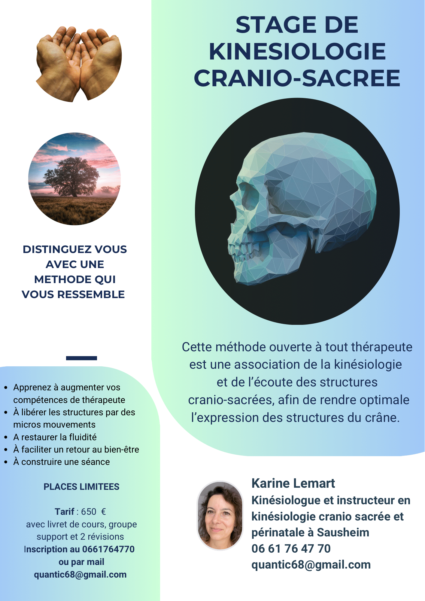 Je vous propose de découvrir lors d’un atelier les outils de kinésiologie, cette journée est accessible à tous sans pré-requis, ainsi que des stages de Kinésiologie Cranio-Sacrée sans pré requis, si vous avez la fibre de l’Autre